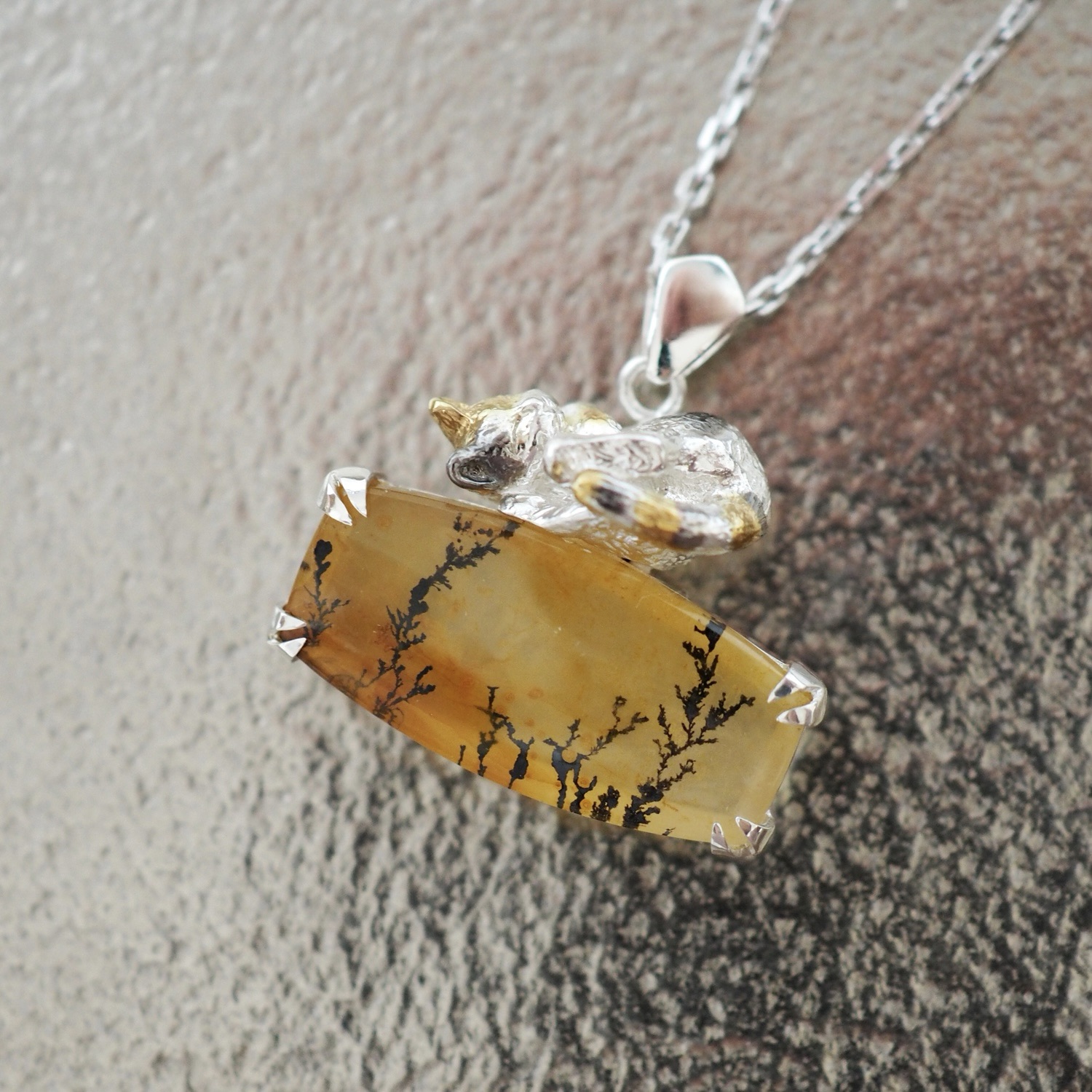 今日ご紹介するのは、デンドリティッククォーツの眠り猫ペンダント。