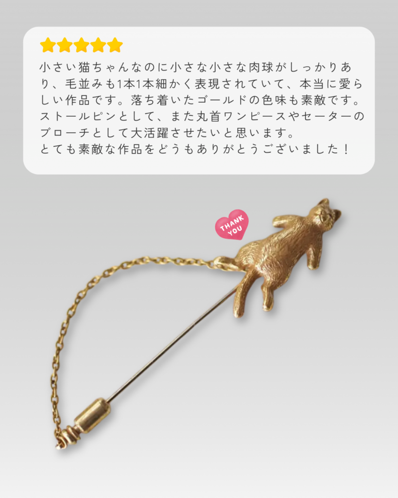 猫のピンブローチに素敵なレビューも頂きました。