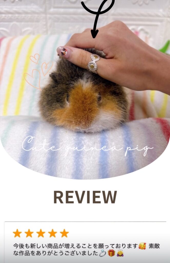 「私は金属のリングが嫌いなモルモットを飼っているのですが、近づけて嗅がせたりしてもこのリングは嫌がりませんでした♥️ 何も気にせずつけたまま、今後も触れ合うことができそうなのでとても嬉しく思います✨️」