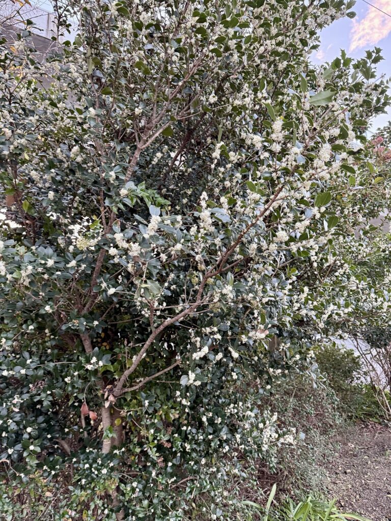 柊っぽい葉だけど、トゲは控えめ 花は白くて、金木犀と同じ“モクセイ科” 金木犀そっくりの甘い香り! 晩秋〜初冬に咲く 今回の香りの犯人はこっちでした。